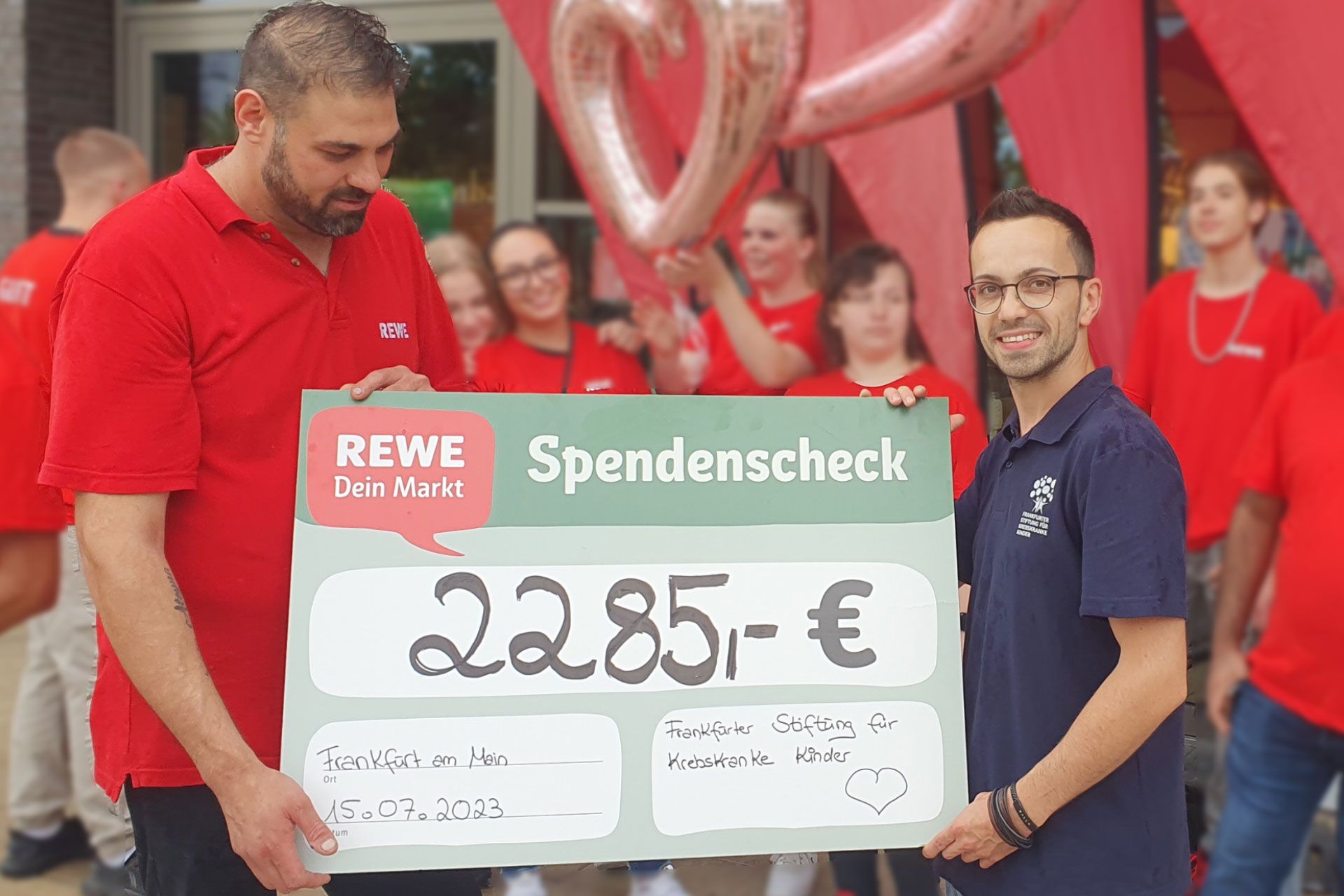 On July 15, 2023, the REWE store at Europaallee 118 in Frankfurt celebrated its 10th anniversary. The manager of the store, Mr. Ali Osman Kayabasi, was very keen to support children’s cancer research. Therefore, he chose the Frankfurt Foundation for Children with Cancer as the recipient of the proceeds of the event.
