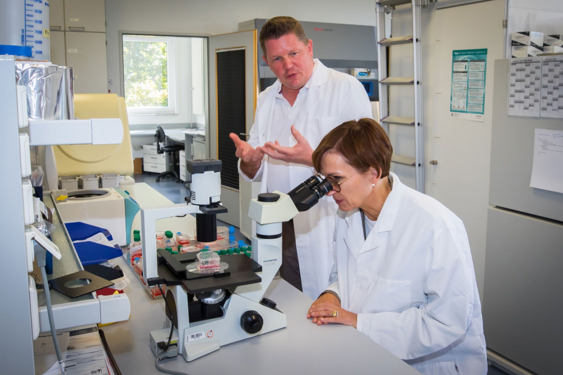 Photo (Roger de Castro/dc-photodesign): Fedral Research Minister Bettina Stark-Watzinger (f.) has Dr. Florian Rothweiler (h.) explain the cell bank to her.