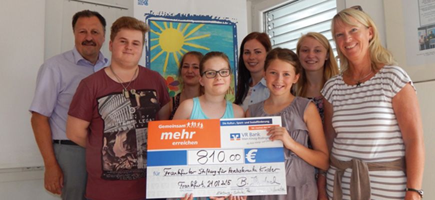 Monetary donation by the team of the theatre group BOLLERATZE of the Alteburg School in Biebergemünd for the benefit of the Frankfurt Foundation for Children with Cancer. One euro from each ticket of the play “Beim Leben meiner Schwester” (On my sister’s life) they performed went to the foundation.