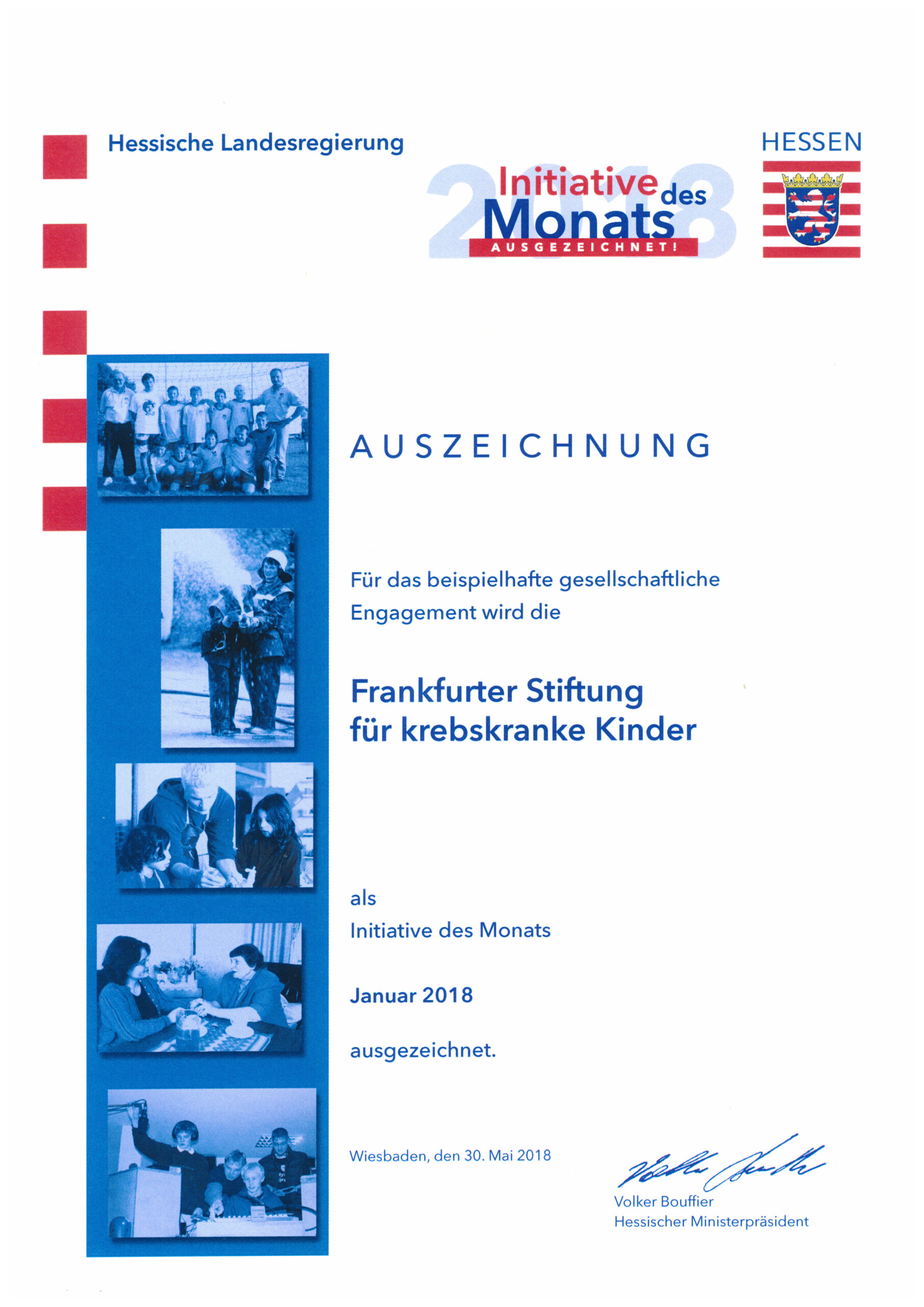 Today, the government spokesman of the Hessian state government, State Secretary Michael Bußer (centre), presented the Frankfurt Foundation for Children with Cancer with the “Initiative of the Month January 2018” award for its exemplary social commitment. Uwe Menger (left, member of the Foundation’s Board of Directors) and Dr Jürgen Vogt (right, Chairman of the Foundation) accepted the award. We are very proud to have been recognised and will use the 500 euros associated with the award for our further commitment.