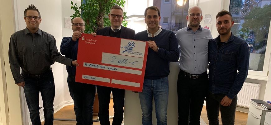 Seit mehreren Jahren unterstützt die Arnold GmbH aus Frankfurt unsere Forschungsarbeit – so auch 2018. Am 4. Dezember nutzte Stiftungs-Geschäftsführer Dirk Kammertöns (3.v.l.) die Gelegenheit, den Spendenscheck in Höhe von 2.018 Euro persönlich von Markus Bernsteiner (3.v.r.) un…
