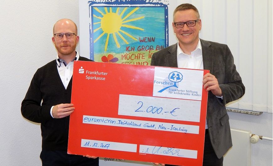 Die Firma euromicron Deutschland GmbH, vertreten durch ihren Marketing Manager Uli Schunk (links im Bild), überreichte unserem Geschäftsführer Dirk Kammertöns am 18. Dezember eine Geldspende über 2.000 Euro. Euromicron verzichtet auch dieses Jahr auf geduckte Weihnachtskarten un…