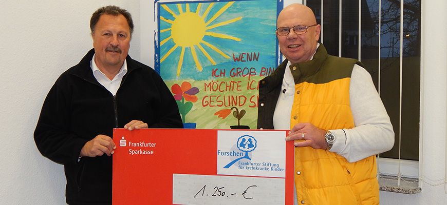 Anlässlich seines 60sten Geburtstages überreicht Herr Wolfgang Mittelbach (rechts) mit den Worten „Vor 30 Jahren wurde mir Dank der Krebsforschung ein neues Leben geschenkt“ dem Geschäftsführer der Frankfurter Stiftung für krebskranke Kinder Herrn Starck (rechts) eine „Geburtsta…