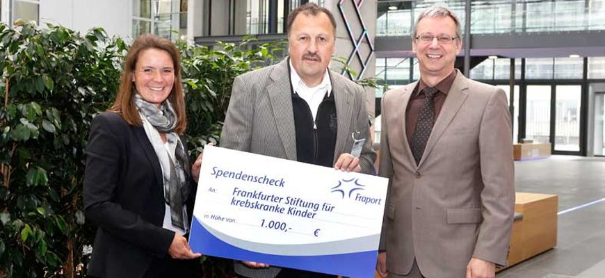 The Frankfurt Foundation for Children with Cancer receives a donation cheque for 1,000 euros at Fraport AG’s new corporate headquarters.